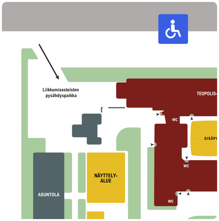 Kadulta käännytään oikealle parkkipaikalle, missä esteettömän reitin tarvitseva henkilö voi jäädä auton kyydistä.